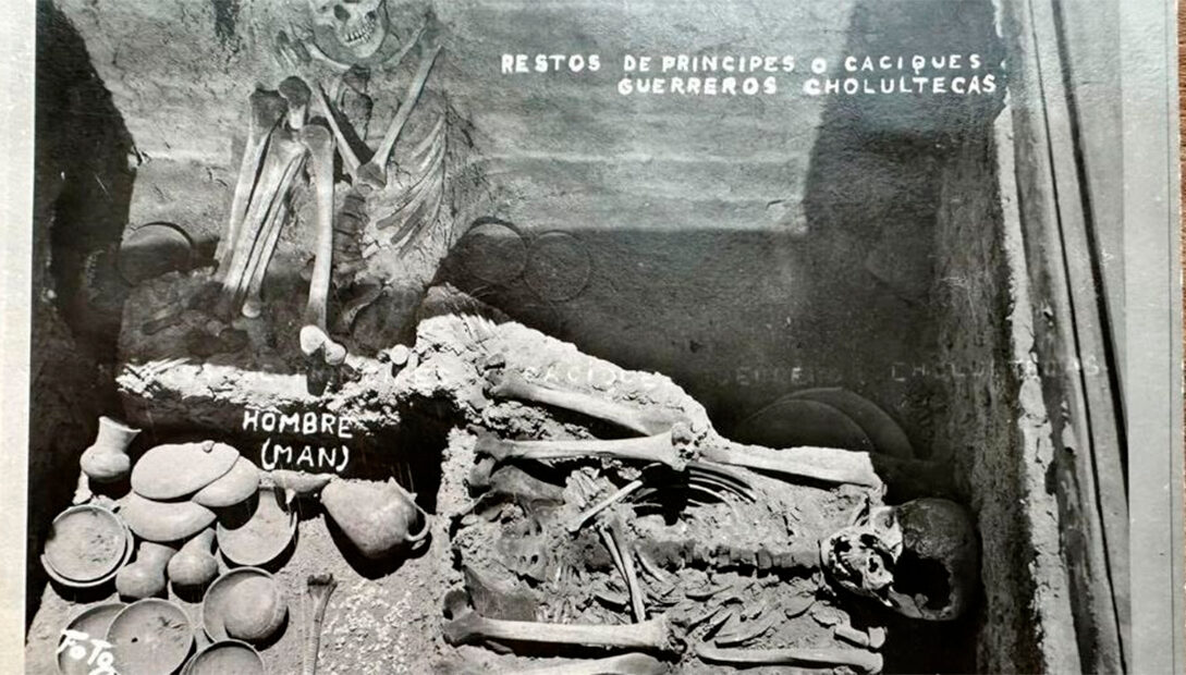 La zona noreste de la gran Pirámide de Cholula expondrá los esqueletos de un hombre y una mujer. Según el investigador del INAH Sergio Suárez Cruz, los restos reflejan los antiguos sistemas de vida y prácticas funerarias. El esqueleto femenino se presenta con utensilios de cocina y objetos de ornamento, mientras que el masculino fue acompañado por instrumentos y armas ceremoniales.