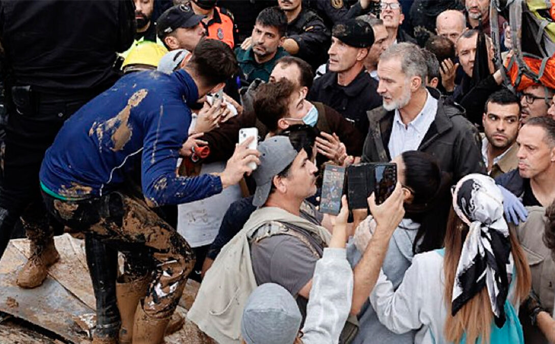 En medio de la devastación causada por las lluvias torrenciales en Valencia, la visita del rey Felipe VI y de los presidentes del gobierno español, Pedro Sánchez, y de la Comunidad Valenciana, Carlos Mazón, desató una ola de protestas entre los habitantes de Paiporta, una de las zonas más afectadas. Al inicio de la visita oficial, los vecinos lanzaron bolas de lodo a la comitiva y gritaron consignas como «asesinos» y «dimisión», exigiendo mayor ayuda ante la catástrofe.